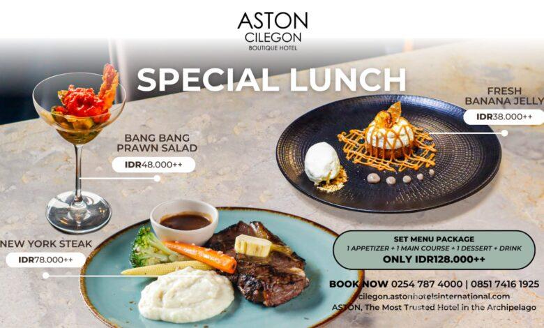 Dalam upaya memenuhi kebutuhan para tamu yang menginginkan pengalaman makan siang yang tidak mahal namun tetap memuaskan, Aston Cilegon Boutique Hotel hadir dengan konsep baru. Tamu tidak diwajibkan untuk memilih menu lengkap, melainkan dapat memilih hanya makanan pembuka dan hidangan utama sesuai dengan selera. Dengan begitu, para tamu dapat menikmati makan siang yang menyenangkan tanpa perlu khawatir dengan harga yang mahal.