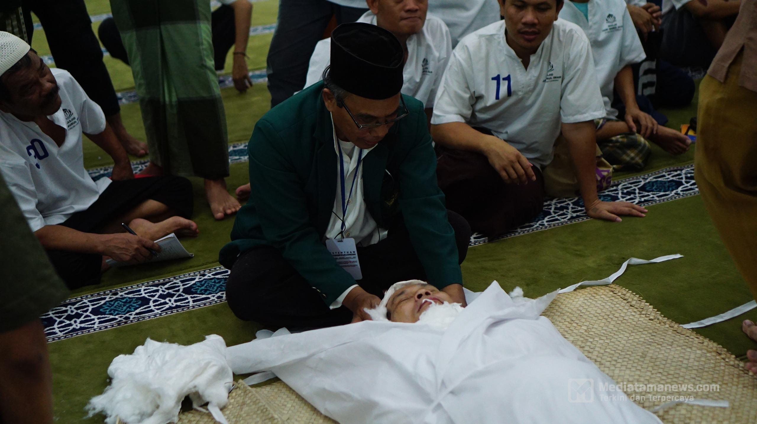KH. Asimun Mas’ud & KH. Ahmad Yani yang didampingi oleh Ustad Husni Mubarok dan Bapak Fitrah selaku Pembina masjid, memberikan contoh saat mengurusi Jenazah./Ist.