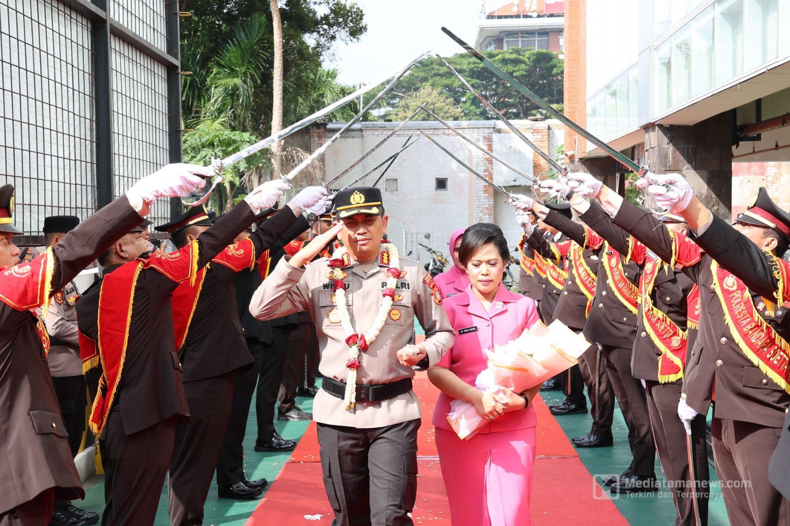 Didampingi sang istri, Kombes Pol Wisnu Wardana lalu melewati barisan pedang pora yang dibawakan sejumlah perwira menengah dan pertama di jajaran Polresta Bandara Soetta.