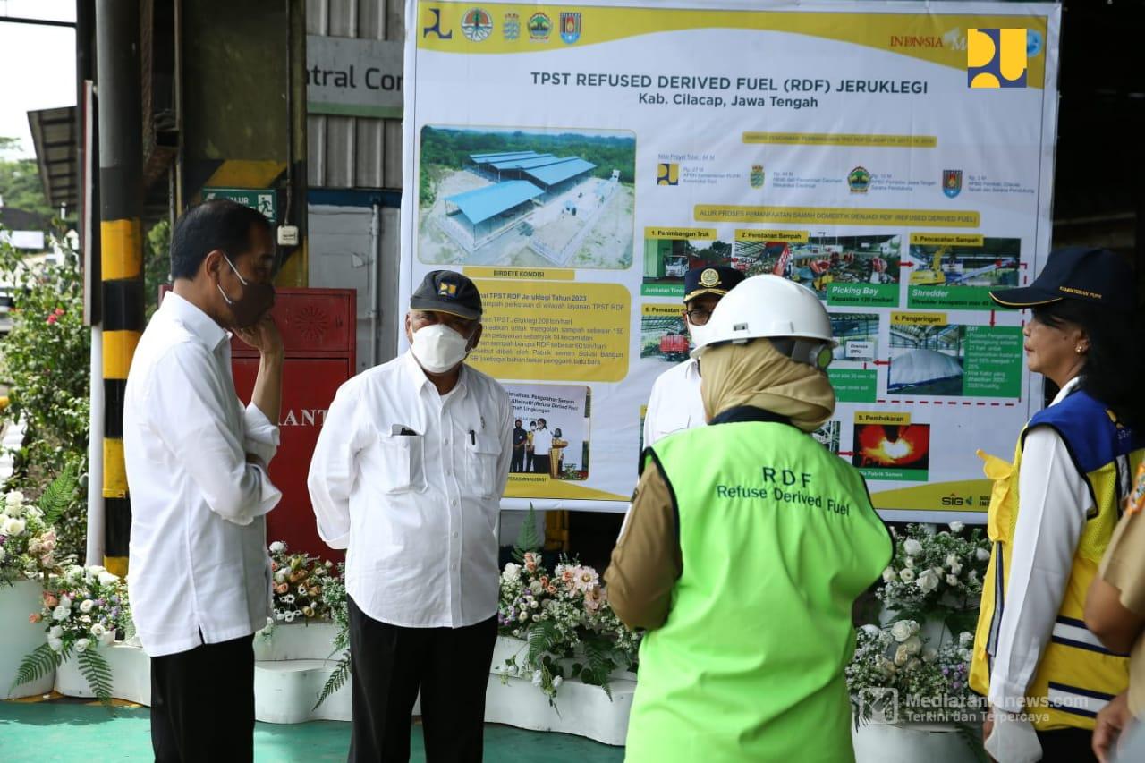 Menteri Pekerjaan Umum dan Perumahan Rakyat (PUPR) Basuki Hadimuljono mendampingi Presiden Joko Widodo (Jokowi) meninjau operasional Tempat Pengolahan Sampah dengan teknologi Refuse Derived Fuel (RDF) di Tempat Pengolahan Sampah Terpadu (TPST) Jeruk Legi, Kabupaten Cilacap, Jawa Tengah/Ist.
