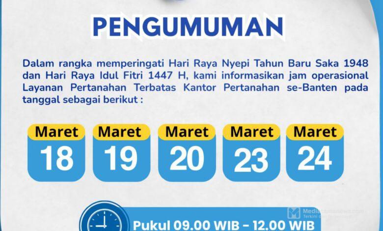 Mediatamanews|Serang (Banten) – Dalam rangka libur Hari Raya Nyepi Tahun Baru Saka 1948 dan Hari Raya Idulfitri 1447 Hijriah, pelayanan pertanahan tetap dibuka secara terbatas pada seluruh Kantor Pertanahan di Wilayah Provinsi Banten.