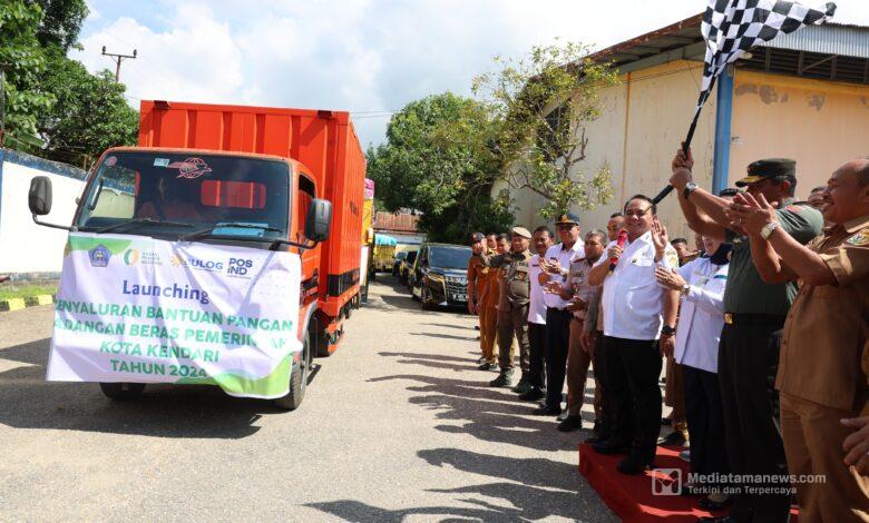Mediatamanews/Kendari – Pj Gubernur Sulawesi Tenggara (Sultra) Andap Budhi Revianto didampingi Pimpinan Wilayah Perum Bulog Drive Sultra Siti Mardati Saing dan Kadis Ketahanan Pangan Pemprov Sultra Ari Sismanto menyampaikan Cadangan Pangan Pemerintah (CPP) berupa beras untuk tahap pertama kepada 219.428 Keluarga Penerima Manfaat ( KPM), bertempat di Gedung Bulog Punggaloba Kendari, Selasa (30/01/24).