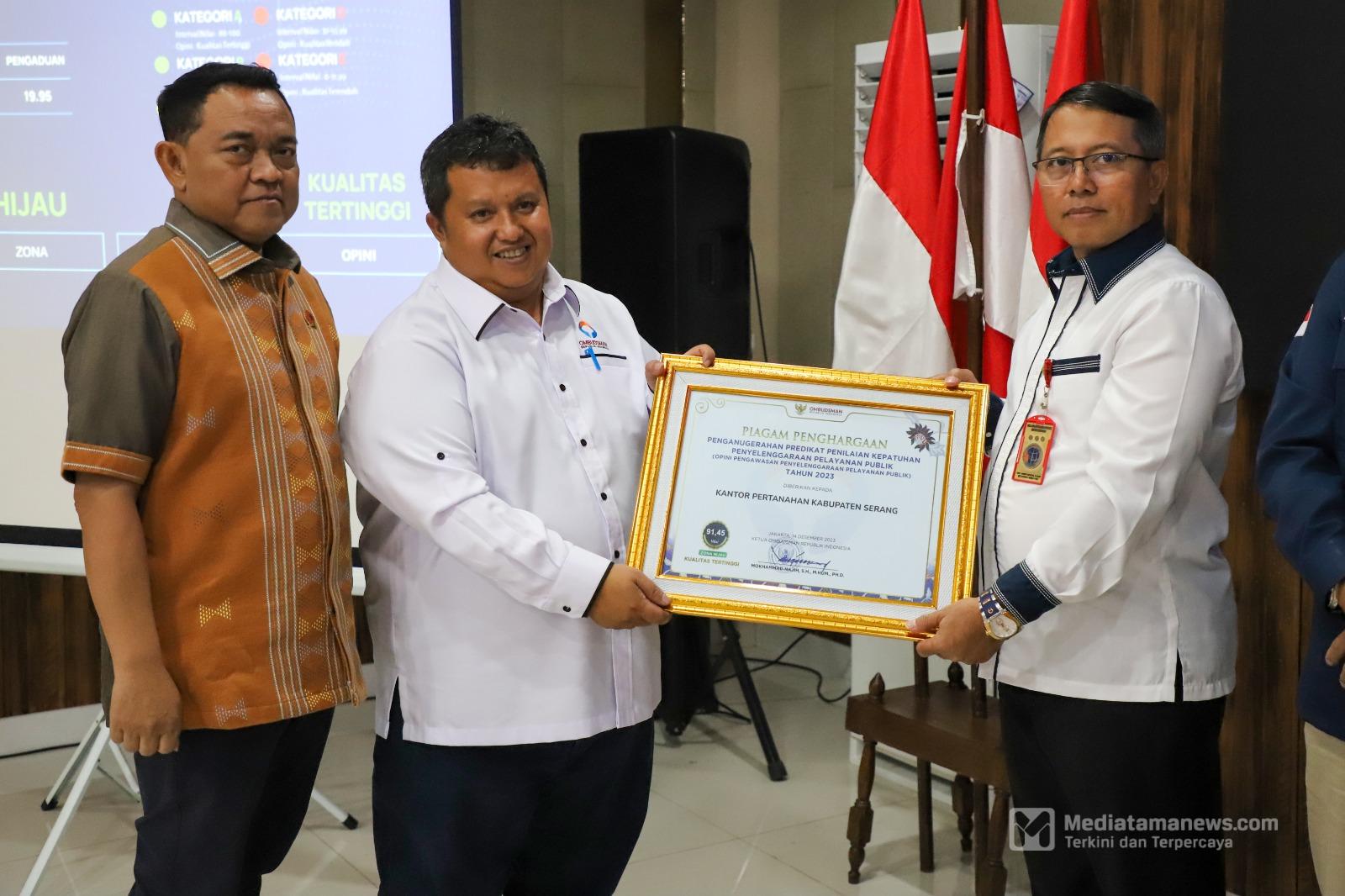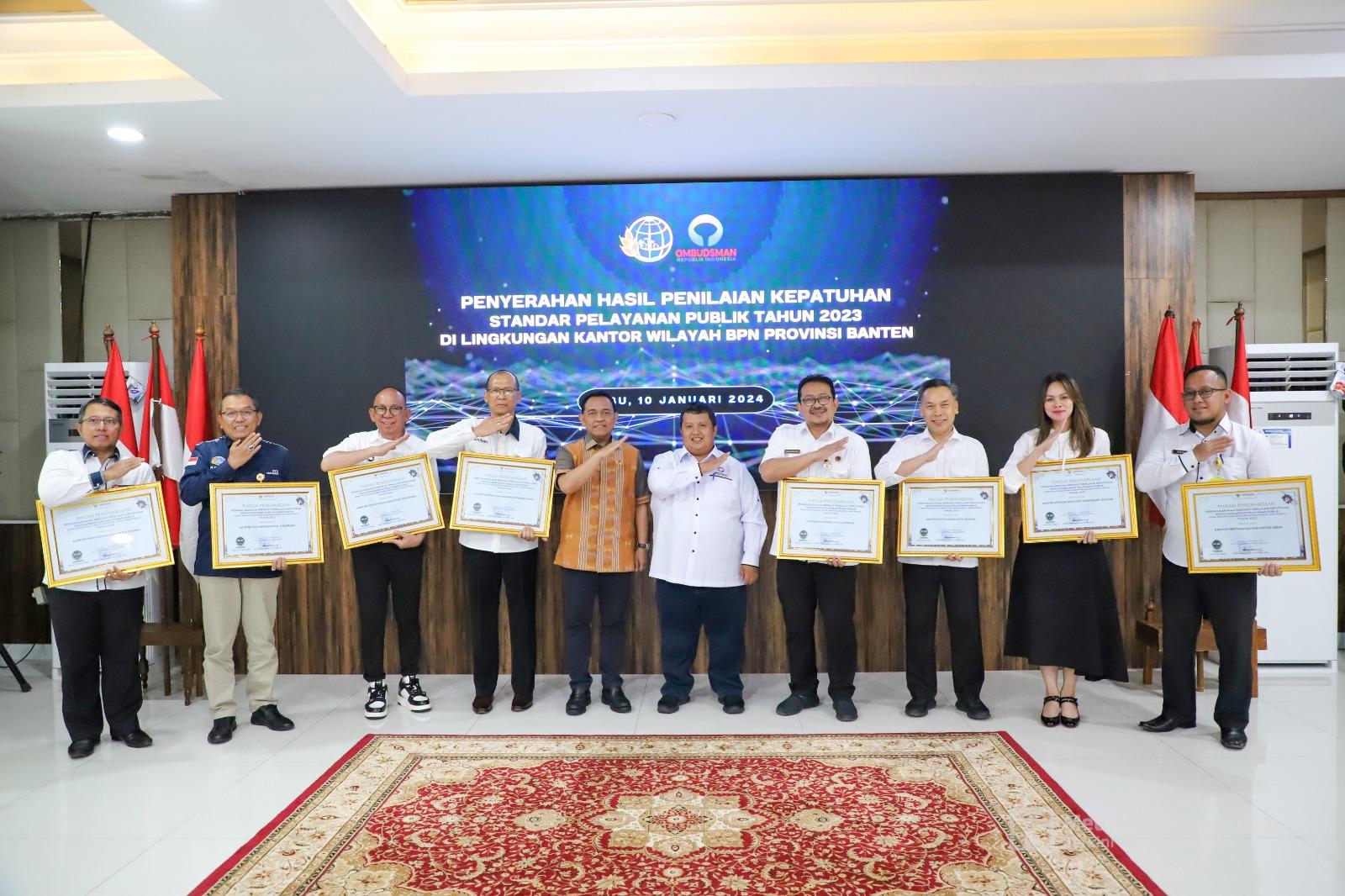 Piagam Penghargaan diserahkan oleh Kepala Perwakilan ORI Banten, Fadli Afriadi didampingi Kepala Kantor Wilayah Badan Pertanahan Nasional (BPN) Provinsi Banten, Sudaryanto dan Kepala Bagian Tata Usaha Kantor Wilayah BPN Provinsi Banten, Osman Affan kepada kepala kantor pertanahan di Aula Baduy Kantor Wilayah BPN Provinsi Banten.