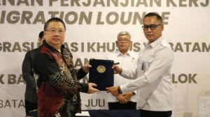Mediatamanews | Batam – Bertempat di Pollux Mall Batam Center, Kepala Kantor Imigrasi Kelas I Khusus TPI Batam, Hajar Aswad bersama Direktur Utama PT Pollux Barelang Megasuperblok, Handojo K.Setyadi menandatangani perjanjian kerja sama penggunaan lokasi Pollux Mall sebagai Immigration Lounge pada Kamis 3 Juli 2025.